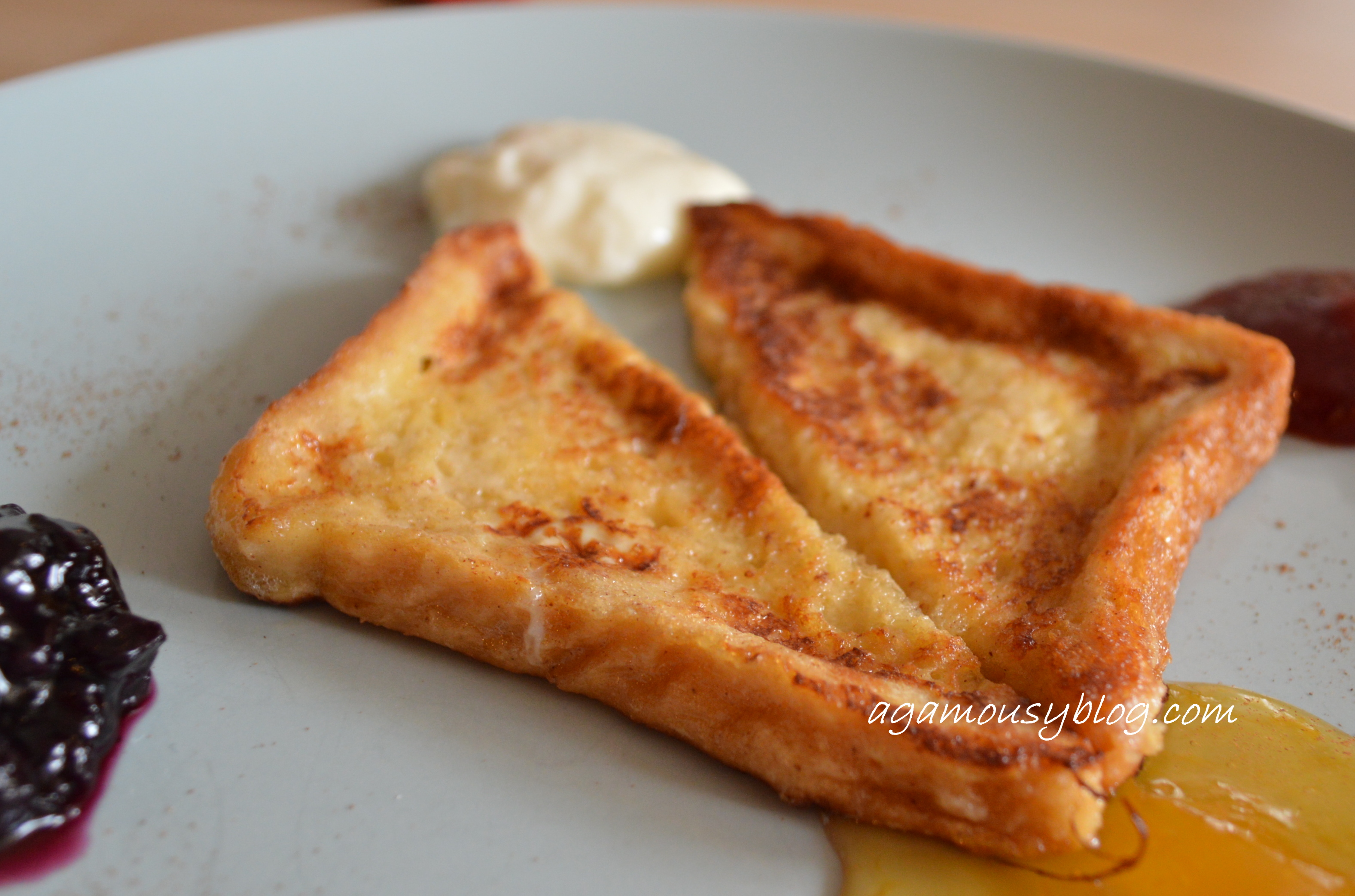Jajka rozbełtałam razem z mlekiem, cukrem, cynamonem i solą. Chleb tostowy przekroiłam na pół tj. w trójkąciki i każdy kawałek zamoczyłam, uklepałam i zostawiłam, żeby porządnie nasiąkł razem z pozostałymi. Po ok 30 minutach, wszystkie kawałki trafiły na rozgrzaną, posmarowaną masłem patelnię i były smażone do momentu kiedy stały się złote, skarmelizowane i chrupiące. Wyszła cynamonowo-waniliowa pychota. Testy wykazały, że z dodatków w postaci: waniliowego serka oraz trzech rodzajów dżemów: truskawkowego, jagodowego oraz morelowego, najlepszy jest serek :) Ale co ja Wam będę sugerować – sami spróbujcie.DSC_0158