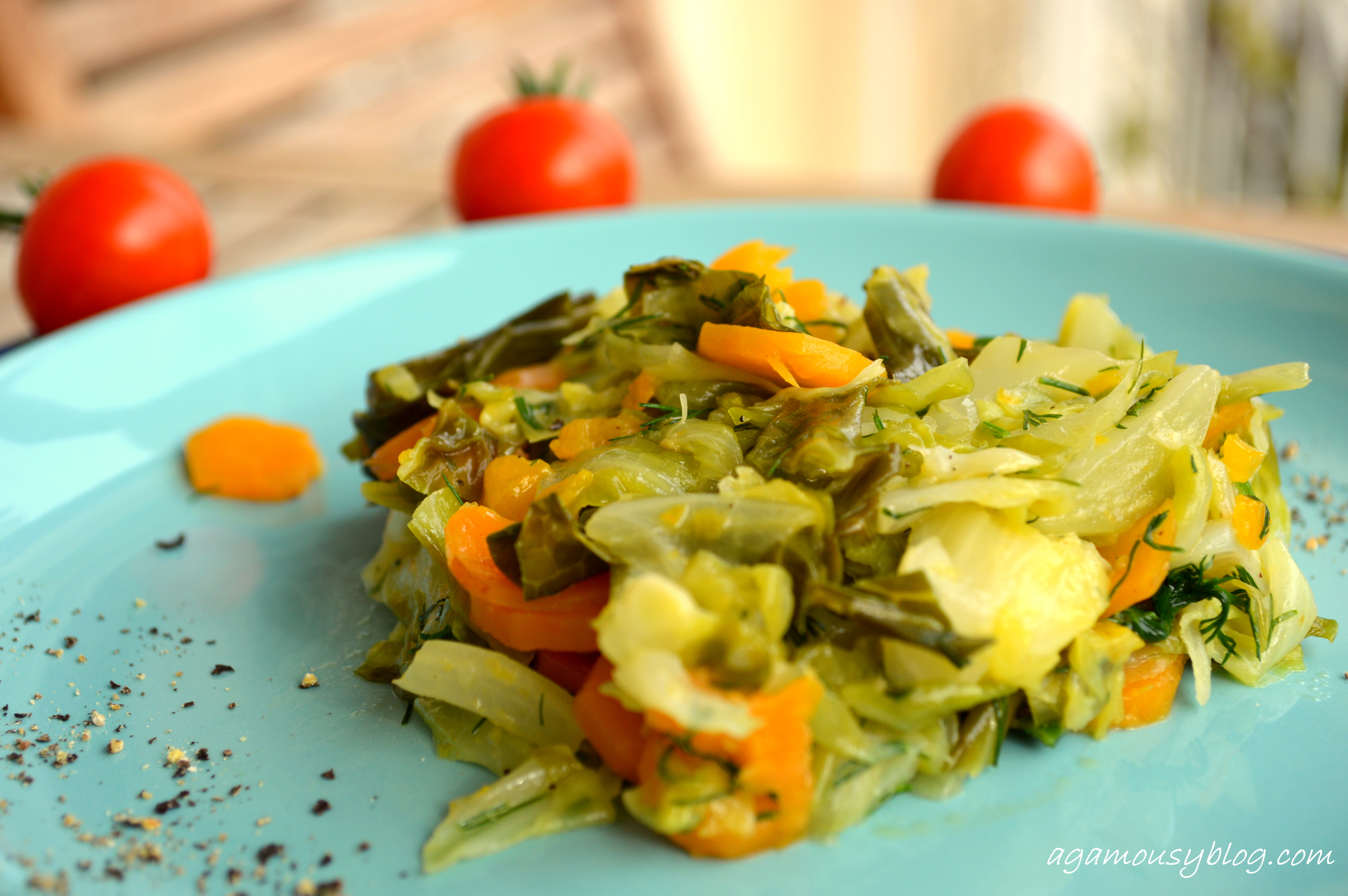 Składniki (3-4 osoby): 1 główka młodej kapusty, 1 1/2 pęczka młodej marchewki, 2/3 pęczka koperku, 2 łyżki masła, ok 1/4 kubeczka wody, 2-3 łyżeczki soli, pieprz, 1/2 łyżeczki cukru.
