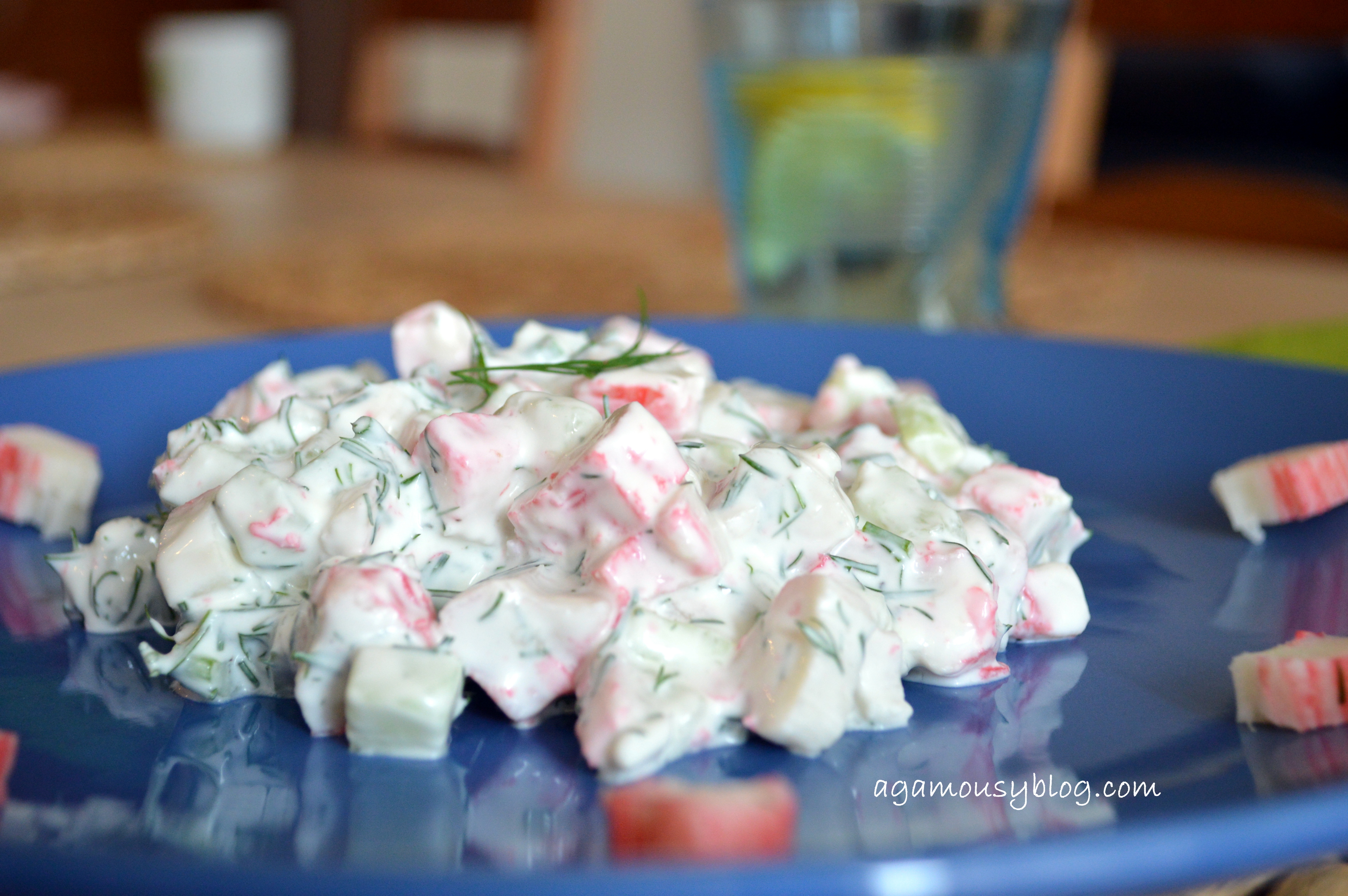 Składniki: 1-1,5 paczki paluszków krabowych, 2 średnie zielone ogórki, 1 pęczek koperku, 1 średni ząbek czosnku, 1 duży jogurt naturalny (najlepiej grecki), 1 łyżka majonezu, 1 płaska łyżeczka soli, pieprz do smaku.